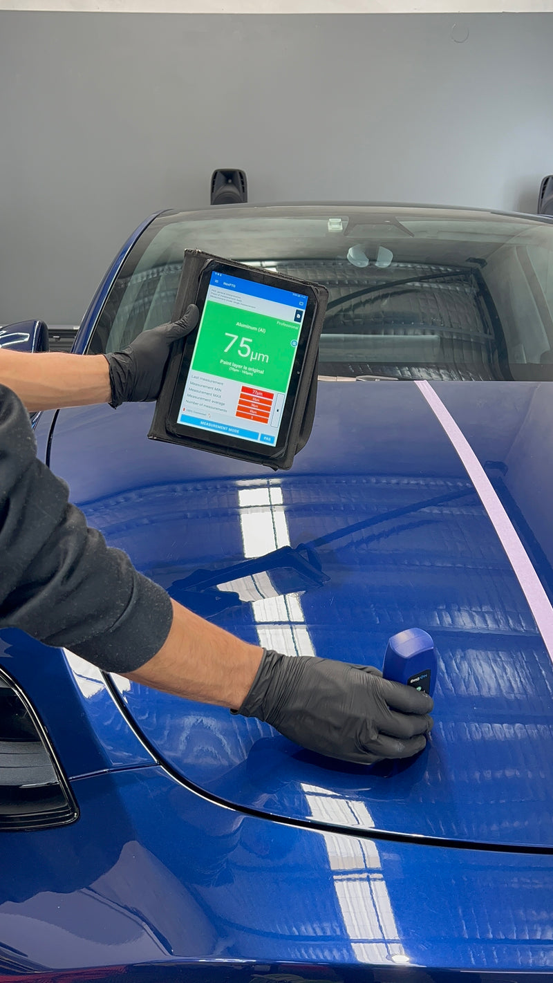 Under good lighting, we inspect and take paint measurements to see if we are dealing with factory paint or if paint is too thin.